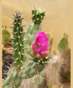 De Opuntia imbricata, ook wel bekend als: Cylindropuntia imbricata of Cholla is een dunne rechtopgroeiende cactus met mooie roze bloemen, de cylindervormige groei onderscheidt deze cactus van de andere Opuntia’s die steeds nieuwe schijven groeien. Naarmate de plant ouder wordt krijgt hij steeds meer verhoute stengels. Onder de juiste omstandigheden kan de cactus wel meer dan 2 meter hoog worden!